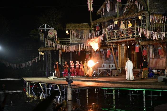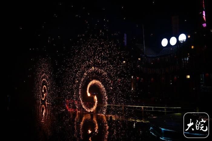 当天晚上,采访团实地体验了小镇的核心节目——以池州傩文化为根基,打造的一场震撼视听的傩戏盛典《傩王传奇》。记者在现场看到,实景演艺将表演秀、灯光秀、烟花秀与徽派建筑完美融合,水、电、雷、火的视觉冲击让游客仿佛穿越时空,亲身参与这场千年文化盛宴。