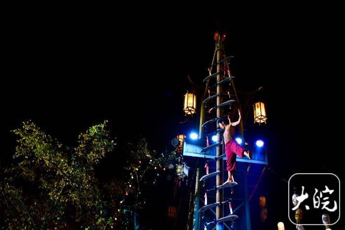 r在傩戏镇实景演出现场,一项源自傩文化的国家级非遗绝技——“上刀山”,将现场气氛推向高潮。这项扎根于驱邪祈福古老传说的技艺,在铿锵的锣鼓声中展现出震撼人心的力量。表演者赤手赤脚,在利刃交错的刀梯上稳健攀爬,更上演“倒挂金钩”“岩鹰展翅”等高难度动作,全程安然无恙。